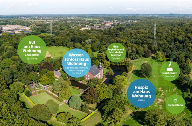 Das Areal rund um das geplante Hospiz entwickelt sich zu einem lebendigen Ort der Begegnung. Über viele Jahrzehnte war Haus Wohnung ein abgeschiedener und weitgehend verborgener Ort. Mit dem Einzug der Niederrheinischen Akademie für medizinische Fort- und Weiterbildung in die Schlossräumlichkeiten und der Vermietung der Räume für Businessveranstaltungen hat sich dieser Charakter bereits schrittweise gewandelt.